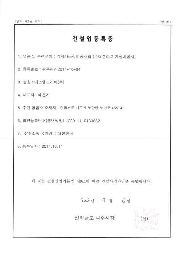 Certificate of Construction Business Registration (Mechanical Facility… 본문 Certificate of Construction Business Registration (Mechanical Facility Licensing)_SMKorea Co., Ltd. List