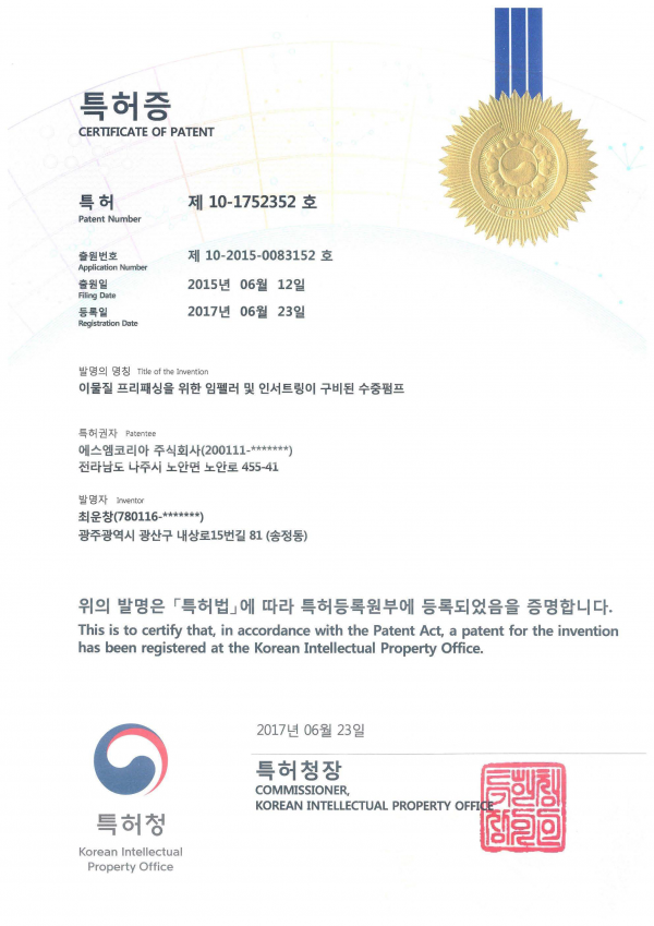 Patent 1‐Impeller and insert ring for the submersible pump for pre‐pas… 본문 Patent 1‐Impeller and insert ring for the submersible pump for pre‐passing foreign substances (10‐1752352) List