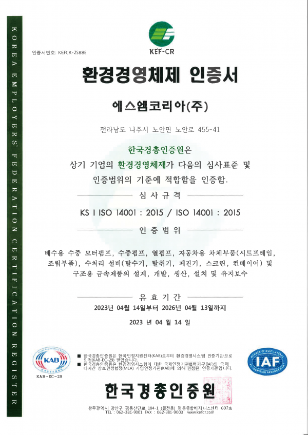 ISO‐14001(Certificate of Environmental Management System) 본문 ISO‐14001(Certificate of Environmental Management System) List